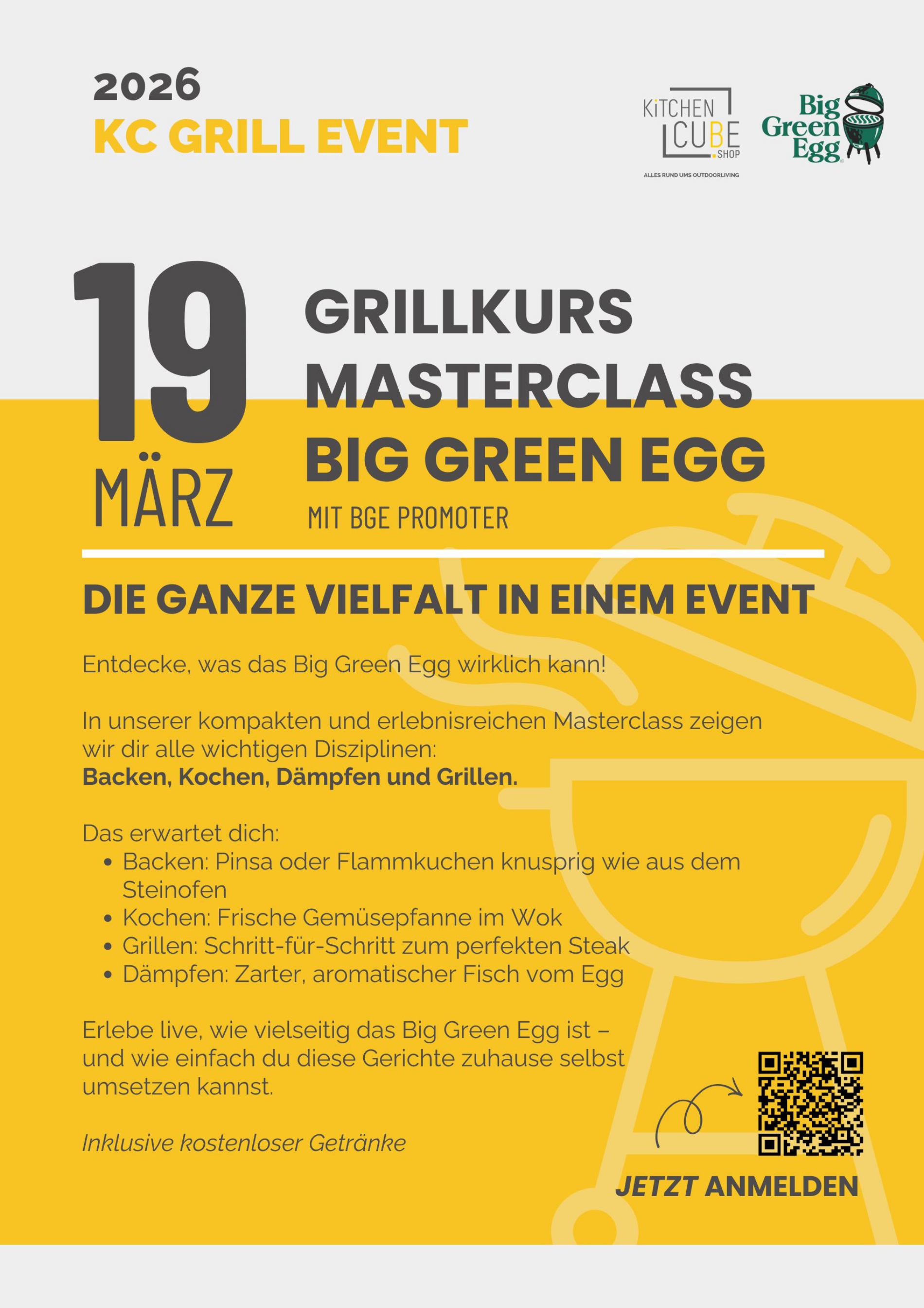 Entdecke, was das Big Green Egg wirklich kann! In unserer kompakten und erlebnisreichen Masterclass zeigen wir dir alle wichtigen Disziplinen: Backen, Kochen, Dämpfen und Grillen.